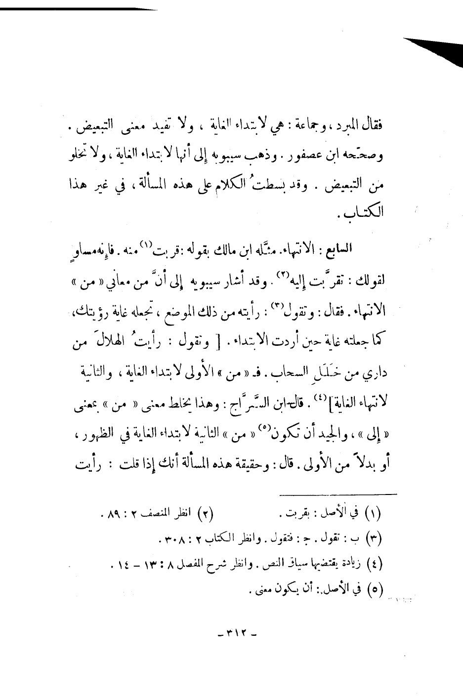 فقال المبرد، وجماعة: هي لابتداء الغاية، ولا تفيد معنى التبعيض. وصححه ابن عصفور. وذهب سيبويه إلى أنها لابتداء الغاية، ولا تخلو من التبعيض. وقد بسطت الكلام على هذه المسألة، في غير هذا الكتاب.
