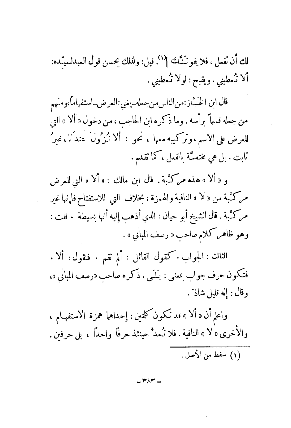 وألا هذه مركبة. قال ابن مالك: ألا التي للعرض مركبة من لا النافية والهمزة، بخلاف التي للإستفتاح فإنها غير مركبة. قال الشيخ أبو حيان: الذي أذهب إليه أنها بسيطة. قلت: وهو ظاهر كلام صاحب رصف المباني.