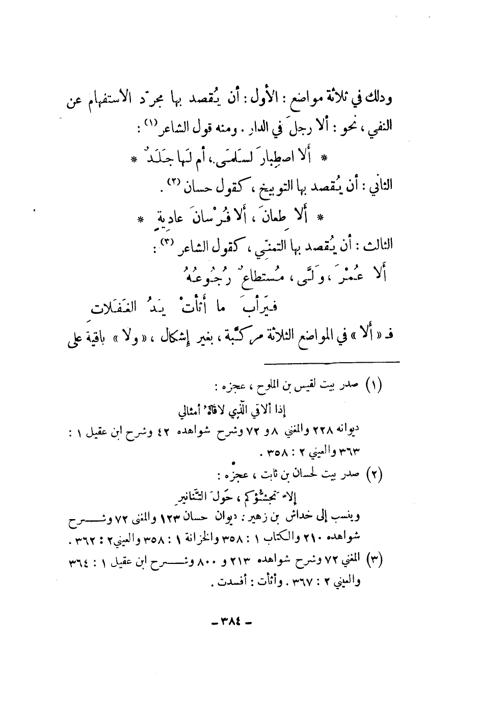 وذلك في ثلاثة مواضع: الأول: أن يقصد بها مجرد الاستفهام عن النفي، نحو: ألا رجل في الدار. ومنه قول الشاعر: ألا اصطبار لسلمى، أم لها جلد الثاني: أن يقصد بها التوبيخ، كقول حسان.