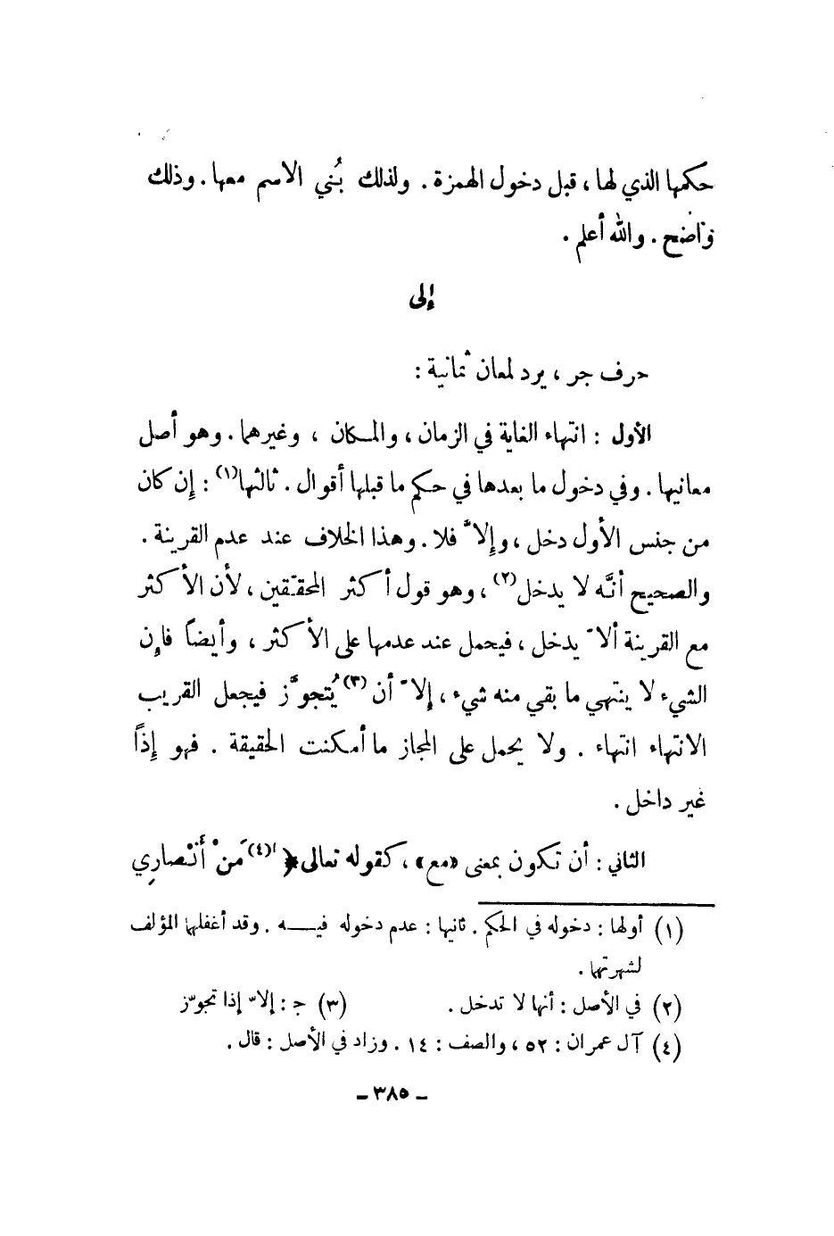 حرف جر، يرد لمعان ثمانية: الأول: انتهاء الغاية في الزمان، والمكان، وغيرهما. وهو أصل معانيها. وفي دخول ما بعدها في حكم ما قبلها أقول. ثالثها: إن كان من جنس الأول دخل، وإلا فلا. وهذا الخلاف عند عدم القرينة مع القرينة ألا يدخل، فيحمل عند عدمها على الأكثر، وأيضاً فإن الشيء لا ينتهي ما بقي منه شيء، إلا أن يتجوز فيجعل القريب الانتهاء انتهاء. ولا يحمل على المجاز ما أمكنت الحقيقة. فهو إذاً غير داخل.