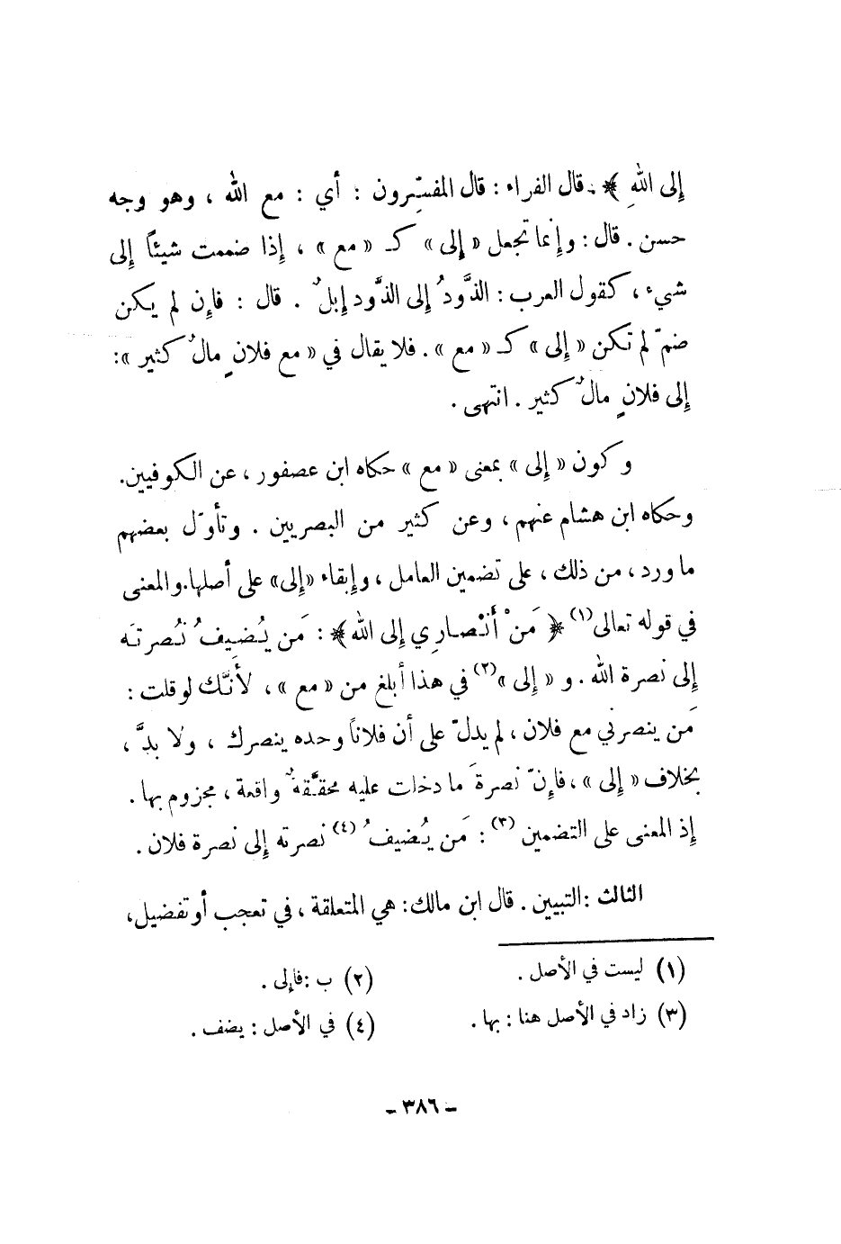 وكون إلى بمعنى مع حكاه ابن عصفور، عن الكوفيين. وحكاه ابن هشام عنهم، وعن كثير من البصريين. وتأويل بعضهم ما ورد، من ذلك، على تضمين العامل، وإبقاء إلى على أصلها والمعنى في قوله تعالى " من أنصاري إلى الله ": من يضيف نصرته إلى نصرة الله. وإلى في هذا أبلغ من مع، لأنك لو قلت: من ينصرني مع فلان، لم يدل على أن فلاناً وحده ينصرك، ولا بد، بخلاف إلى، فإن نصرة ما دخلت عليه محققة واقعة، مجزوم بها. إذ المعنى على التضمين: من يضيف نصرته إلى نصرة فلان.