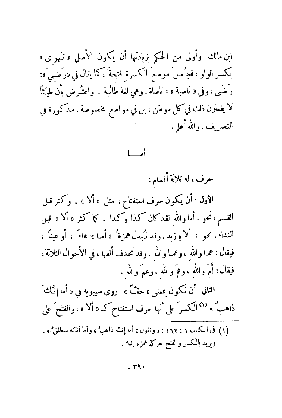 حرف، له ثلاثة أقسام: الأول: أن يكون حرف استفتاح، مثل ألا. وكثر قبل القسم، نحو: أما والله لقد كان كذا وكذا. كما كثر ألا قبل النداء، نحو: ألا يا زيد. وقد تبدل همزة أما هاء، أو عيناً، فيقال: هما والله، وعما والله وقد تحذف ألفها، في الأحوال الثلاثة، فيقال: أم والله، وهم والله، وعم والله.