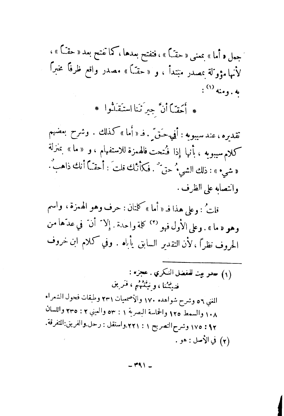 جعل أما بمعنى حقاً، فتفتح بعدها، كما تفتح بعد حقاً، لأنها مؤولة بمصدر مبتدأ، وحقاً مصدر واقع ظرفاً مخبراً به ومنه: أحقاً أن جيرتنا استقلوا تقديره، عند سيبويه: أفي حق. فأما كذلك. شرح بعضهم كلام سيبويه، بأنها إذا فتحت فالهمزة للإستفهام، وما بمنزلة شيء: ذلك الشيء حق. فكأنك قلت: أحقاً أنك ذاهب. وانتصابه على الظرف.
