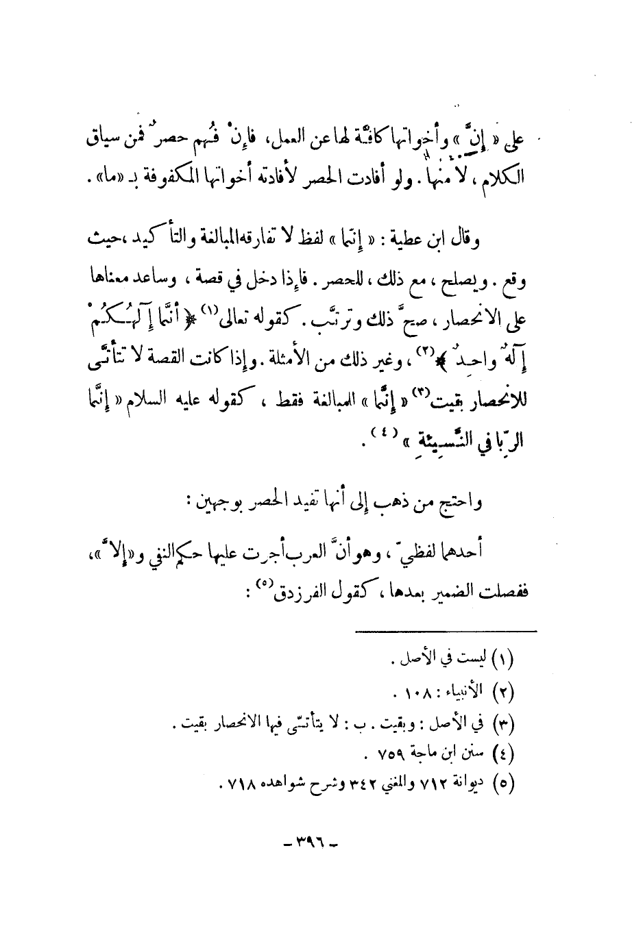 وقال ابن عطية: إنتما لفظ لا تفارقه المبالغة والتأكيد، حيث وقع. ويصلح، مع ذلك، للحصر. فإذا دخل في قصة، وساعد معناها على الأنحصار، صح ذلك وترتب. كقوله تعالى " أنتما آلهكم إله واحد "، وغير ذلك من الأمثلة. وإذا كانت القصة لا تتأنى للإنحصار بقيت إنما للمبالغة فقط، كقوله عليه السلام إنما الربا في النسيئة.