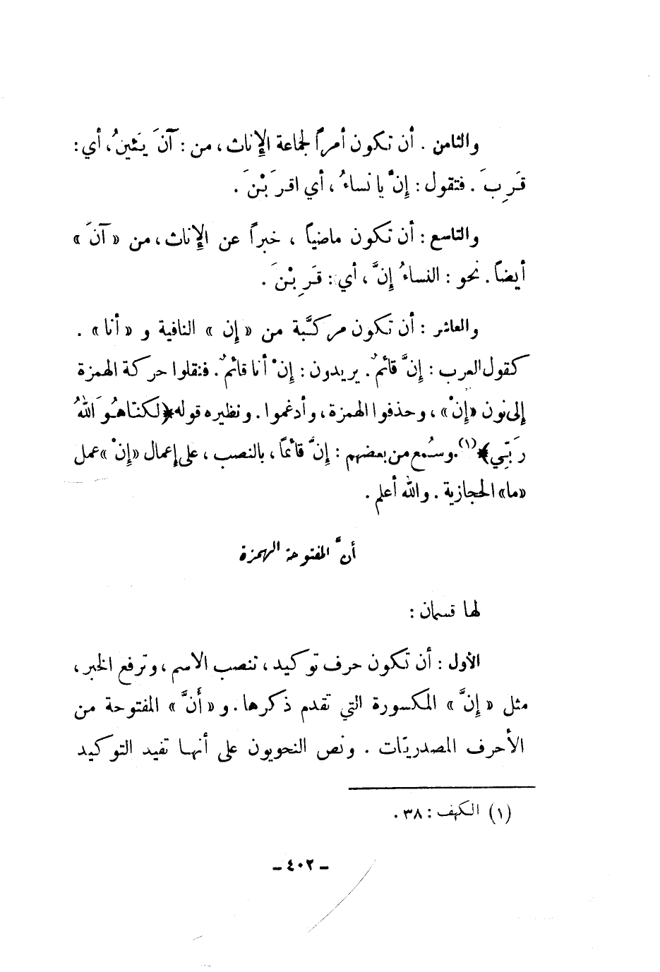 لها قسمان: الأول: أن تكون حرف توكيد، تنصب الاسم، وترفع الخبر، مثل إن المكسورة التي تقدم ذكرها. وأن المفتوحة من الأحرف المصدريات. ونص النحويون على أنها تفيد التوكيد