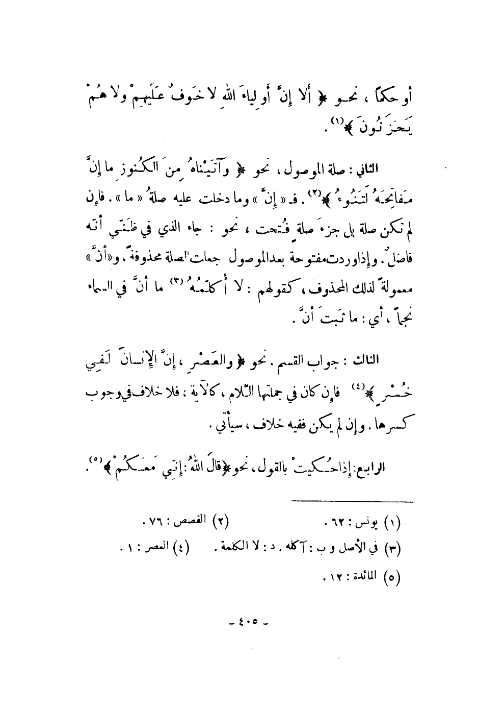 الثاني: صلة الموصول، نحو " وآتيناه من الكنوز ما إن مفاتحه لتنوء ". فإن وما دخلت عليه صلة ما. فإن لم تكن صلة بل جزء صلة فتحت، نحو: جاء الذي في ظني أنه فاضل. وإذا وردت مفتوحة بعد الموصول جعلت الصلة محذوفة، وأن معمولة لذلك المحذوف، كقولهم: لا أكلمه ما أن في السماء نجماً، أي: ما ثبت أن.