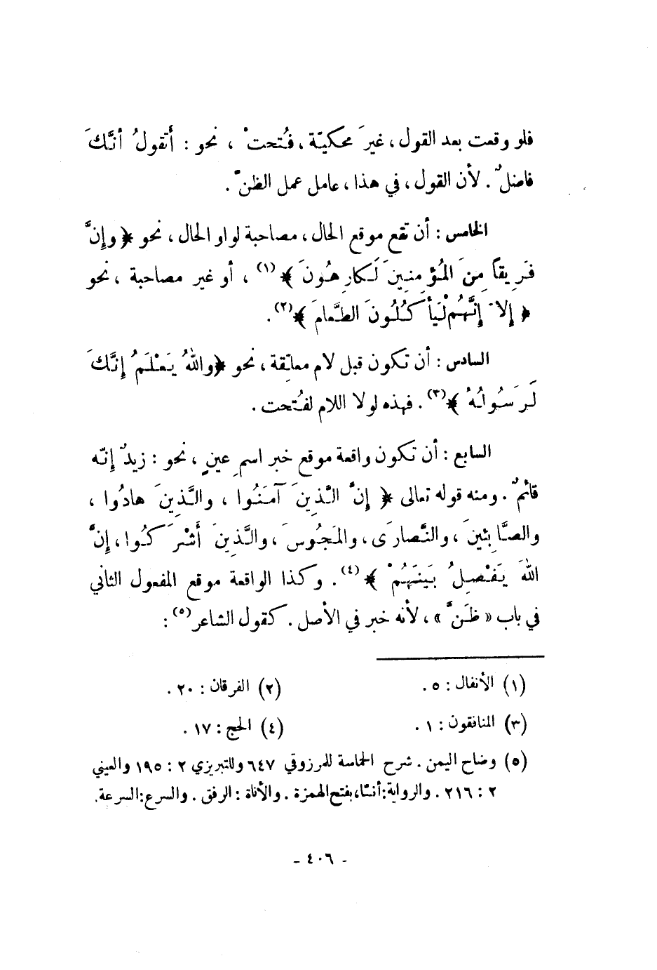 السادس: أن تكون قبل لام معلقة، نحو " والله يعلم إنك لرسوله ". فهذه لولا اللام لفتحت.
