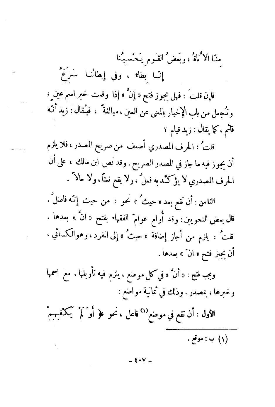 الثامن: أن تقع بعد حيث نحو: من حيث إنه فاضل. قال بعض النحويين: وقد أولع عوام الفقهاء بفتح أن بعدها قلت: يلزم من أجاز إضافة حيث إلى المفرد، وهو الكسائي، أن يجيز فتح أن بعدها.