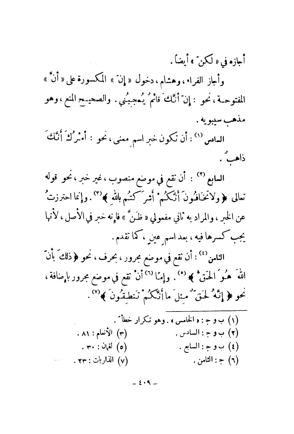 السابع: أن تقع في موضع منصوب، غير خبر، نحو قوله تعالى " ولا تخافون أنكم أشر كتم الله ". وإنما احترزت عن الخبر، والمراد به ثاني مفعولي ظن فإنه خبر في الأصل، لأنها يجب كسرها فيه، بعد اسم عين، كما تقدم.
