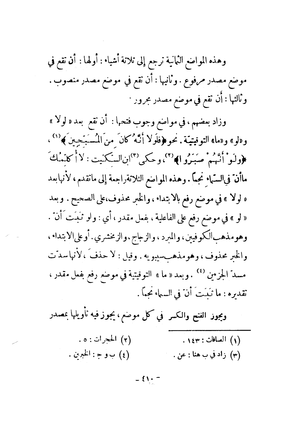 وزاد بعضهم، في مواضع وجوب فتحها: أن تقع بعد لولا ولو وما التوقيتية. نحو " فلولا أنه كان من المسبحين "، " ولو أنهم صبروا "، وحكى ابن السكيت: لا أكلمك ما أن في السماء نجماً. وهذه المواضع الثلاثة راجعة إلى ما تقدم، لأنها بعد لولا في موضع رفع بالابتداء، والخبر محذوف، على الصحيح. وبعد لو في موضع رفع على الفاعلية، بفعل مقدر، أي: ولو ثبت أن. وهو مذهب الكوفيين، والمبرد، والزجاج، والزمخشري. أو على الابتداء، والخبر محذوف، وهو مذهب سيبويه. وقيل: لا حذف، لأنها سدت مسد الجزءين. وبعد ما التوقيتية في موضع رفع بفعل مقدر، تقديره: ما ثبت أن في السماء نجماً.