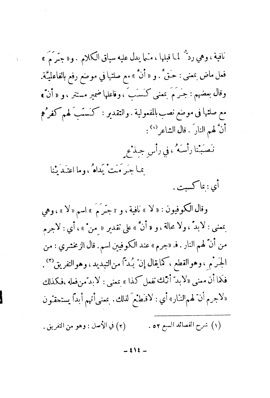 نافية، وهي رد لما قبلها، متما يدل عليه سياق الكلام وجرم فعل ماض بمعنى: حق. وأن مع صلتها في موضع رفع بالفاعلية. وقال بعضهم: جرم بمعنى كسب، وفاعلها ضمير مستتر، وأن مع صلتها في موصع نصب بالمفعولية. والتقدير: كسب لهم كفرهم أن لهم النار. قال الشاعر: