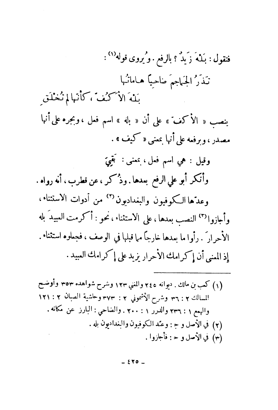 وعدها الكوفيون والبغداديون من أدوات الاستثناء، وأجازوا النصب بعدها، على الاستثناء، نحو: أكرمت العبيد بله الأحرار. رأوا ما بعدها خارجاً مما قبلها في الوصف، فجعلوه استثناء. إذا المعنى أن إكرامك الأحرار يزيد على إكرامك العبيد.