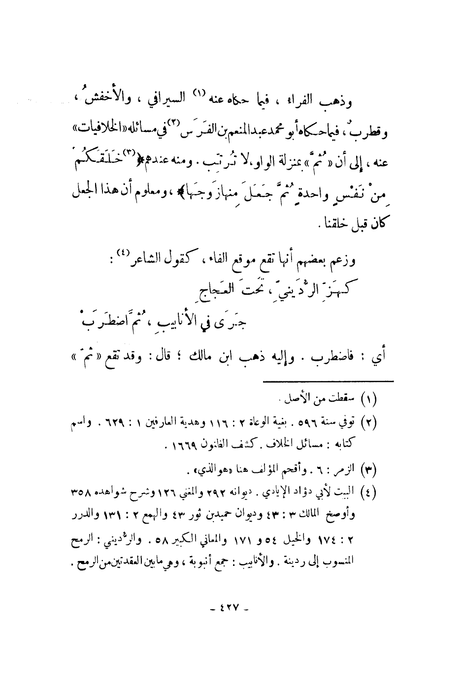وذهب الفراء، فيما حكاه عنه السيرافي، والأخفش، وقطرب، فيما حكاه أبو محمد عبد المنعم بن الفرس في مسائله الخلافيات عنه، إلى أن ثم بمنزلة الواو، لا ترتب. ومنه عندهم " خلقكم من نفس واحدة ثم جعل منها زوجها "، ومعلوم أن هذا الجعل كان قبل خلقنا.