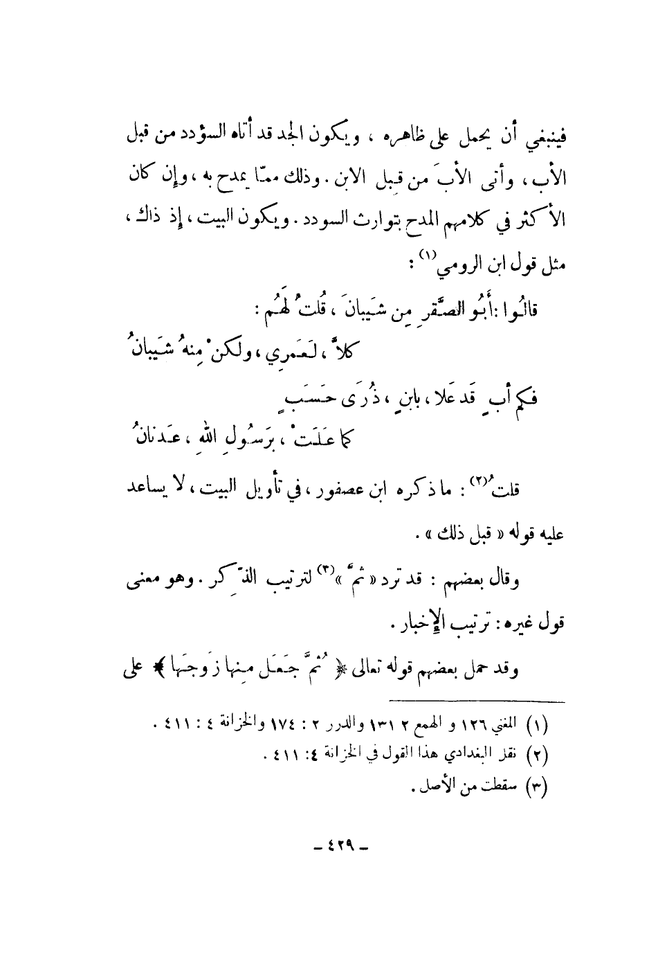 فينبغي أن يحمل على ظاهره، ويكون الجد قد أتاه السؤدد من قبل الأب، وأتى الأب من قبل الابن. وذلك مما يمدح به، وإن كان الأكثر في كلامهم المدح بتوارث السودد. ويكون البيت، إذ ذاك، مثل قول ابن الرومي:
