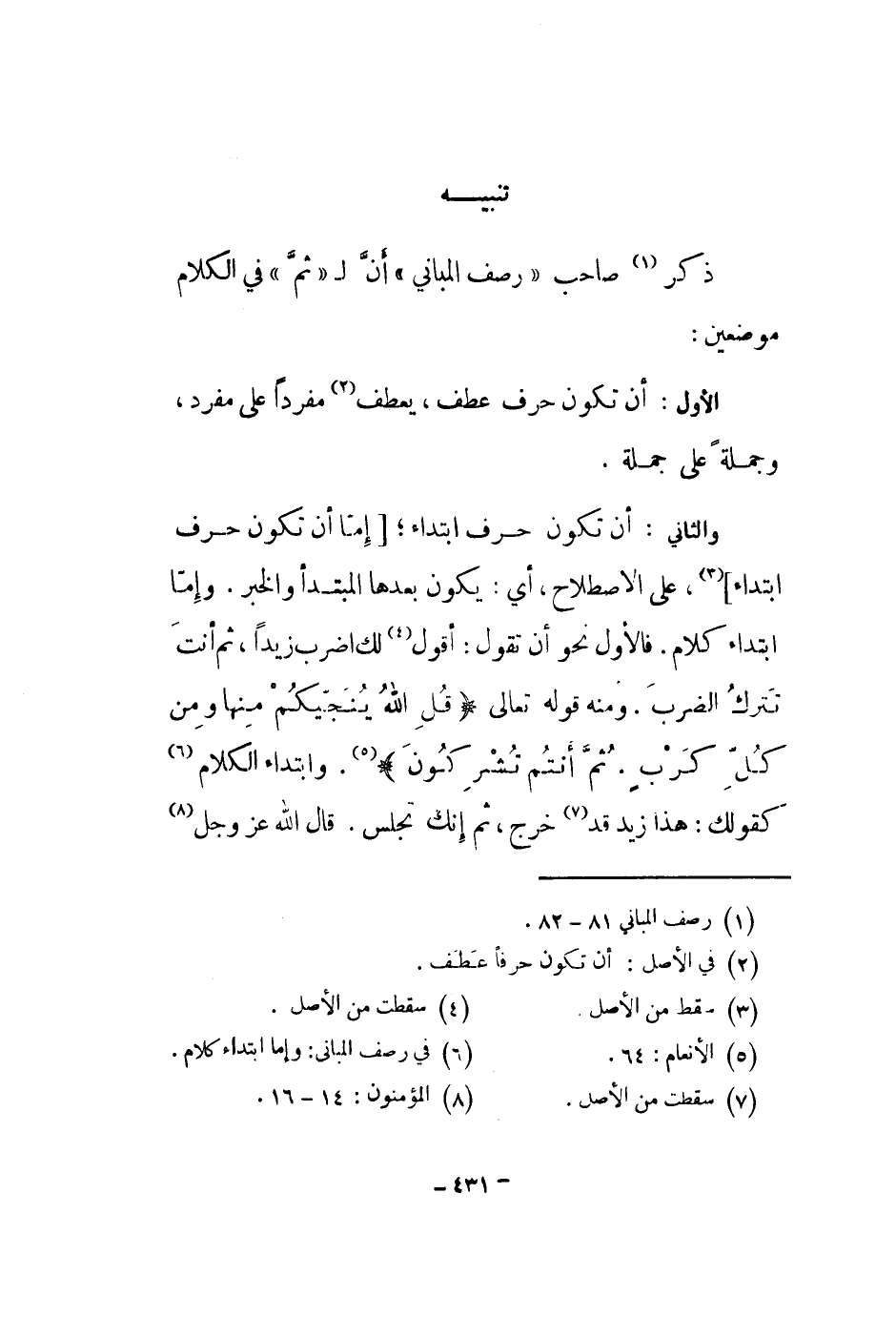 والثاني: أن تكون حرف ابتداء؛ إما أن تكون حرف ابتداء، على الاصطلاح، أي: يكون بعدها المبتدأ والخبر. وإما ابتداء كلام. فالأول نحو أن تقول: أقول لك اضرب زيداً، ثم أنت تترك الضرب. ومنه قول تعالى " قل الله ينتجيكم منها ومن كل كرب. ثم أنتم تشركون ". وابتداء الكلام كقولك: هذا زيد قد خرج، ثم إنك تجلس. قال الله عز وجل