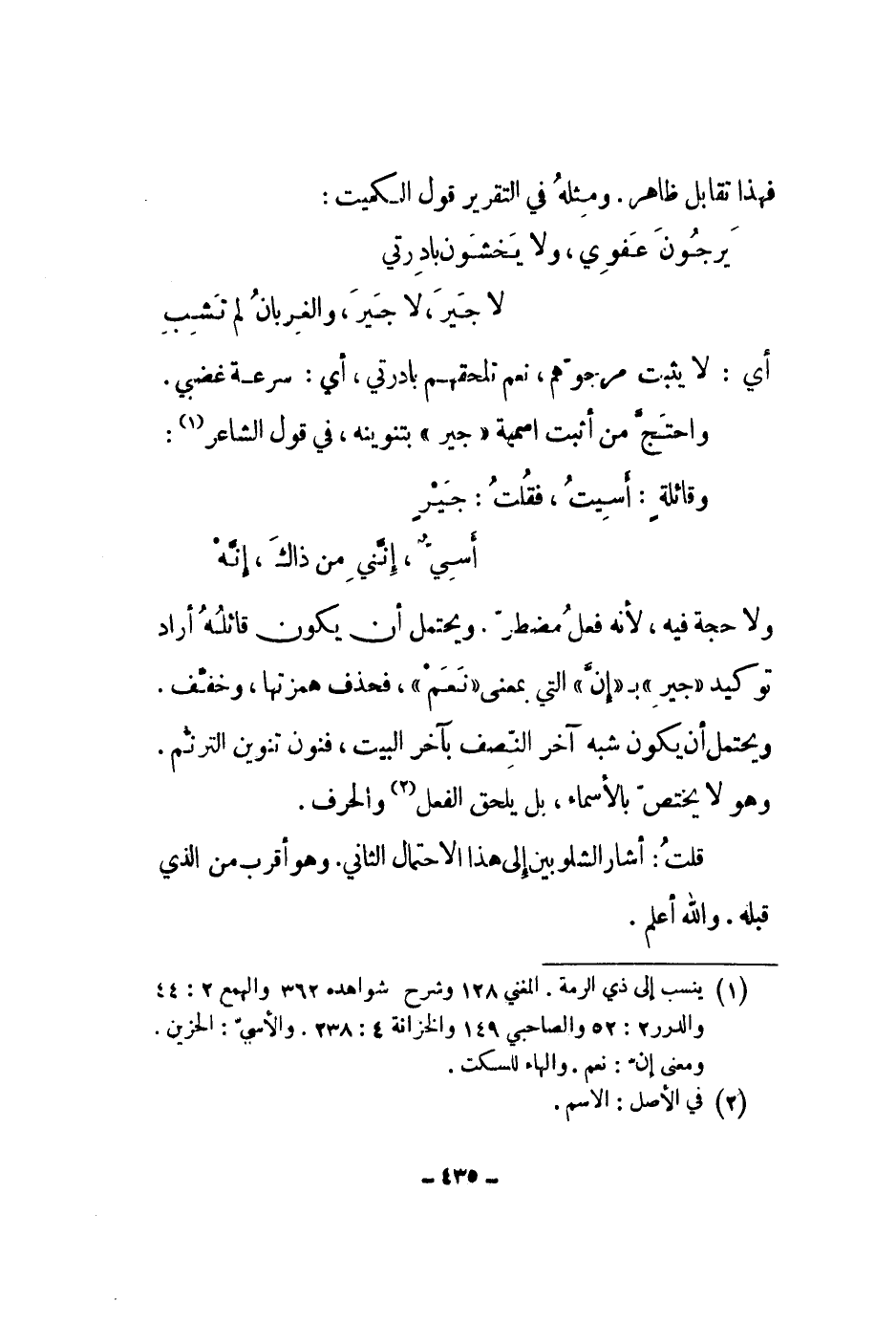 ولا حجة فيه، لأنه فعل مضطر. ويحتمل أن يكون قائلة أراد توكيد جير بإن التي بمعنى نعم، فحذف همزتها، وخفف ويحتمل أن يكون شبه آخر النصف بآخر البيت، فنون تنوين الترنم. وهو لا يختص بالأسماء، بل يلحق الفعل والحرف.