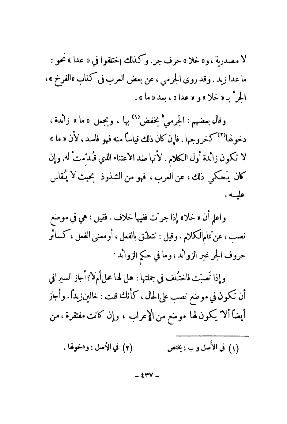 لا مصدرية، وخلا حرف جر. وكذلك اختلفوا في عدا نحو: ما عدا زيد. وقد روى الجرمي، عن بعض العرب في كتاب الفرخ، الجر بخلا وعدا، بعد ما.
