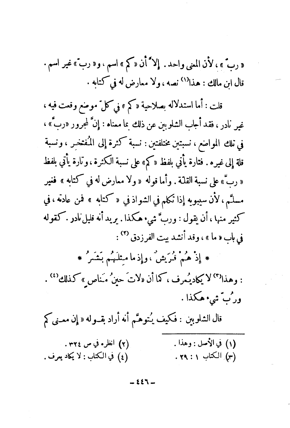 قلت: أما استدلاله بصلاحية كم في كل موضع وقعت فيه، غير نادر، فقد أجاب الشلوبين عن ذلك بما معناه: إن لمجرور رب، في تلك المواضع، نسبتين مختلفتين: نسبة كثرة إلى المفتخر، ونسبة قلة إلى غيره. فتارة يأتي بلفظ كم على نسبة الكثرة، وتارة يأتي بلفظ رب على نسبة القلة. وأما قوله ولا معارض له في كتابه فغير مسلم، لأن سيبويه إذا تكلم في الشواذ في كتابه فمن عادته، في كثير منها، أن يقول: ورب شيء هكذا. يريد أنه قليل نادر. كقوله في باب ما، وقد أنشد بيت الفرزدق: