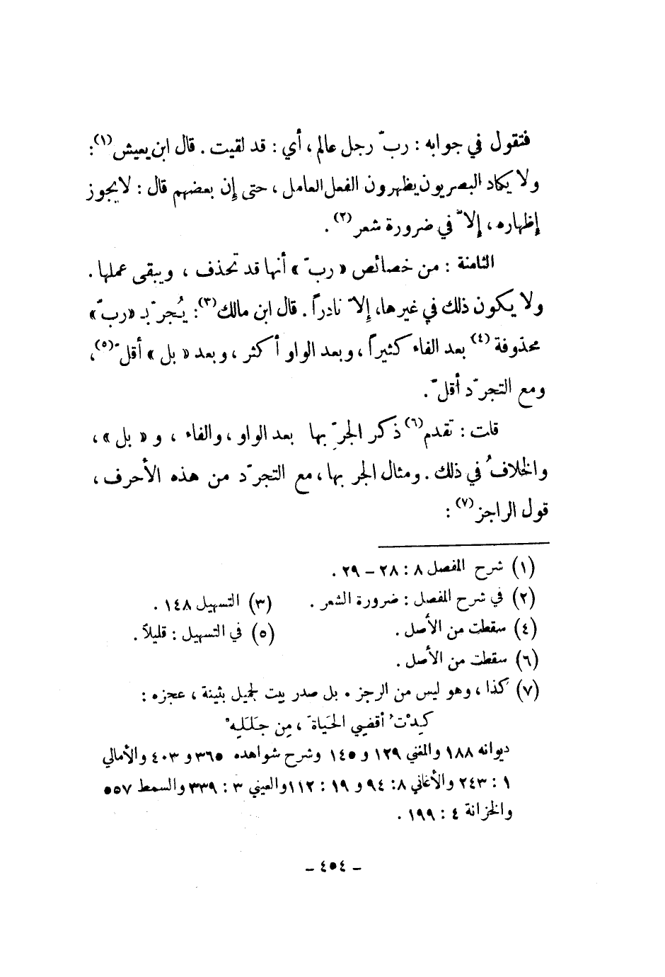الثامنة: من خصائص رب أنها قد تحذف، ويبقى عملها. ولا يكون ذلك ذلك في غيرها، إلا نادراً. قال ابن مالك: يجر برب محذوفة بعد الفاء كثيراً، وبعد الواو أكثر، وبعد بل أقل، ومع التجرد أقل.