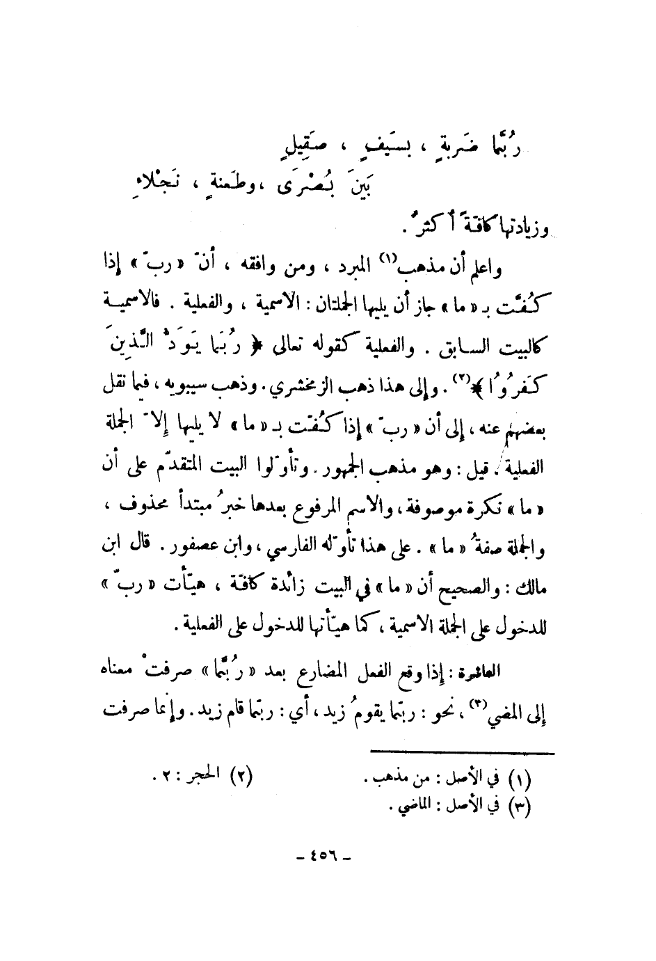 واعلم أن مذهب المبرد، ومن وافقه، أن رب إذا كفت بما جاز أن يليها الجملتان: الأسمية، والفعلية. فالأسمية كالبيت السابق. والفعلية كقول تعالى " ربما يود الذين كفروا ". وإلى هذا ذهب الزمخشري. وذهب سيبويه، فيما نقل بعضهم عنه، إلى أن رب إذا كفت بما لا يليها إلا الجملة الفعلية، قيل: وهو مذهب الجمهور. وتأولوا البيت المتقدم على أن ما نكرة موصوفة، والأسم المرفوع بعدها خبر مبتدأ محذوف، والجملة صفة ما. على هذا تأوله الفارسي، وابن عصفور. قال ابن مالك: والصحيح أن ما في البيت زائدة كافة، هيأت رب للدخول على الجملة الأسمية، كما هيأتها للدخول على الفعلية.