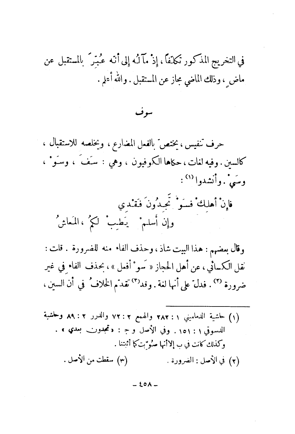 حرف تنفيس، يختص بالفعل المضارع، ويخلصه للإستقبال، كالسين. وفيه لغات، حكاها الكوفيون، وهي: سف، وسو، وسي. وأنشدوا: