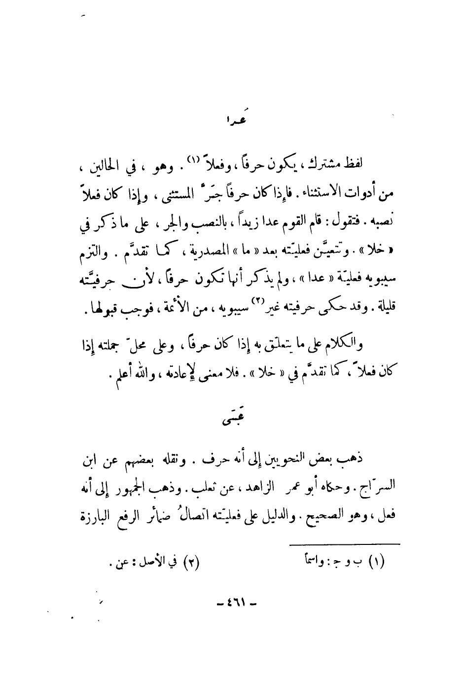 ذهب النحويين إلى أنه حرف. ونقله بعضهم عن ابن السراج. وحكاه أبو عمر الزاهد، عن ثعلب. وذهب الجمهور إلى أنه فعل، وهو الصحيح. والدليل على فعليته اتصال ضمائر الرفع البارزة