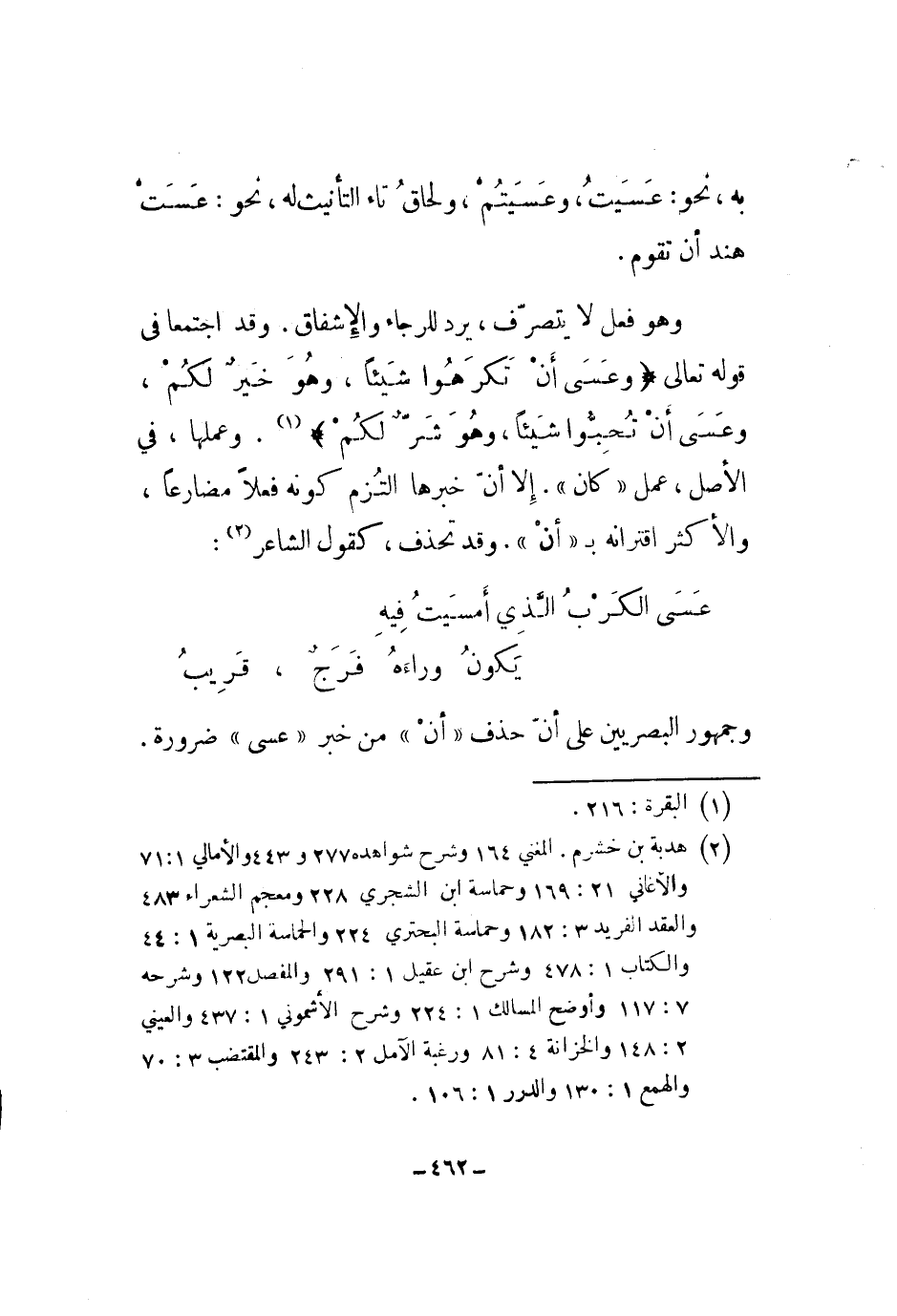 وهو فعل لا يتصرف، يرد للرجاء والإشفاق. وقد اجتمعا في قوله تعالى " وعسى أن تكرهو شيئاً، وهو خير لكم، وعسى أن تحبوا شيئاً، وهو شر لكم ". وعملها، في الأصل، عمل كان. إلا أن خبرها التزم كونه فعلاً مضارعاً، والأكثر اقترانه بأن. وقد تحذف، كقوله الشاعر: