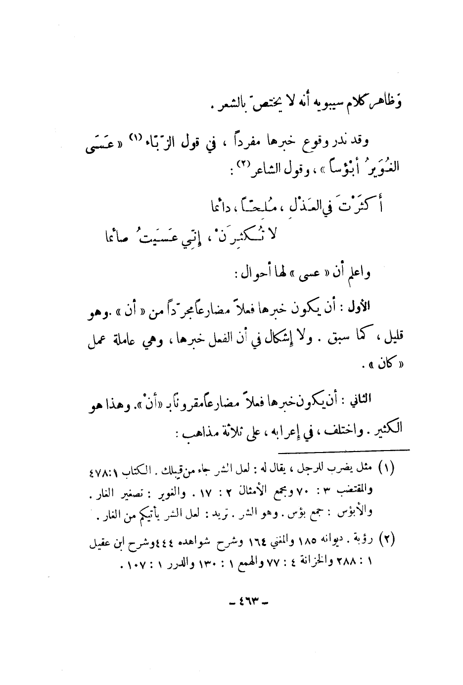 وقد ندر وقوع خبرها مفرداً، في قول الزباء عسى الغوير أبؤساً، وقول الشاعر: