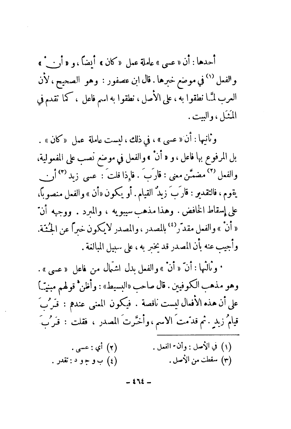وثانيها: أن عسى، في ذلك، ليست عاملة عمل كان. بل المرفوع بها فاعل، وأن والفعل في موضع نصب على المفعولية، والفعل مضمن معنى: قارب. فإذا قلت: عسى زيد أن يقوم، فالتقدير: قارب زيد القيام. أو يكون أن والفعل منصوباً، على إسقاط الخافض. وهذا مذهب سيبويه، والمبرد. ووجهه أن أن والفعل مقدر بالمصدر، والمصدر لا يكون خبراً عن الجثة. وأجيب عنه بأن المصدر قد يخبر به، على سبيل المبالغة.