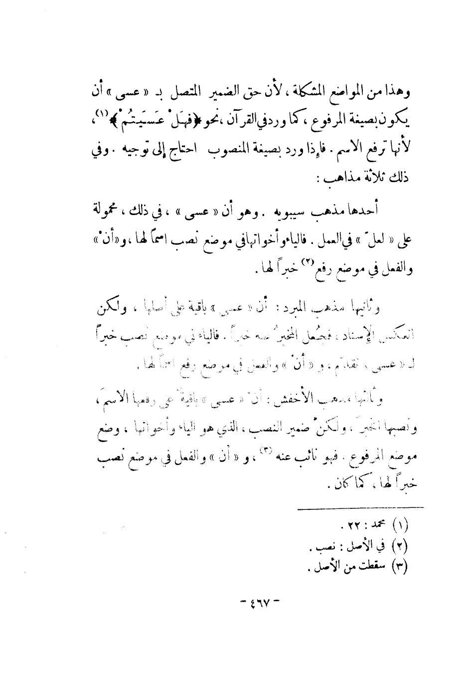 وهذا من المواضع المشكلة، لأن حق الضمير المتصل بعسى أن يكون بصيغة المرفوع، كما ورد في القرآن، نحو " فهل عسيتهم "، لأنها ترفع الأسم. فإذا ورد بصيغة المنصوب احتاج إلى توجيه. وفي ذلك ثلاثة مذاهب: أحدها مذهب سيبويه. وهو أن عسى، في ذلك، محمولة على لعل في العمل. فالياء وأخواتها في موضع نصب اسماً لها، وأن والفعل في موضع رفع خبراً لها.
