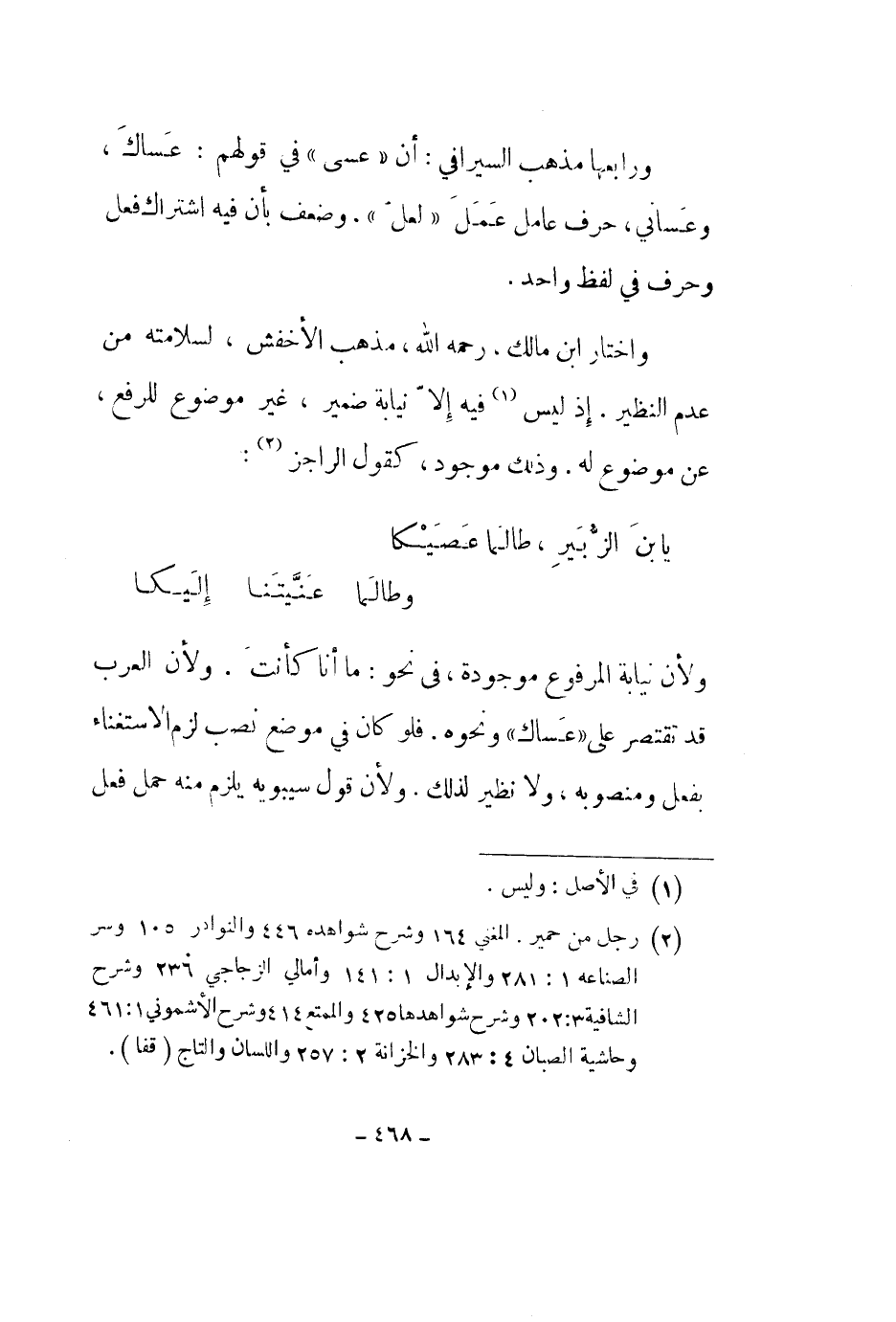 ولأن نيابة المرفوع موجودة، في نحو: ما أنا كأنت. ولأن العرب قد تقتصر على عساك ونحوه. فلو كان في موضع نصب لزم الاستغناء بفعل ومنصوبه، ولا نظير لذلك. ولأن قول سيبويه يلزم منه حمل فعل