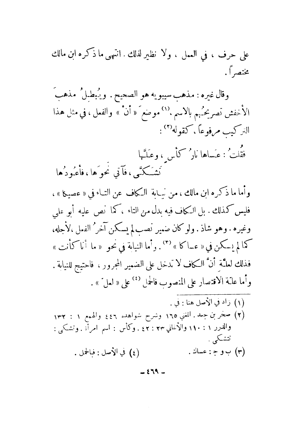 وأما ما ذكره ابن مالك، من نيابة الكاف عن التاء في عصيكا، فليس كذلك. بل الكاف فيه بدل من التاء، كما نص عليه أبو علي وغيره. وهو شاذ. ولو كان ضمير نصب لم يسكن آخر الفعل، لأجله، كما لم يسكن في عساكا. وأما النيابة في نحو ما أنا كأنت فذلك لعلة أن الكاف لا تدخل على الضمير المجرور، فاحتيج للنيابة. وأما علة الاقتصار على المنصوب فالحمل على لعل.