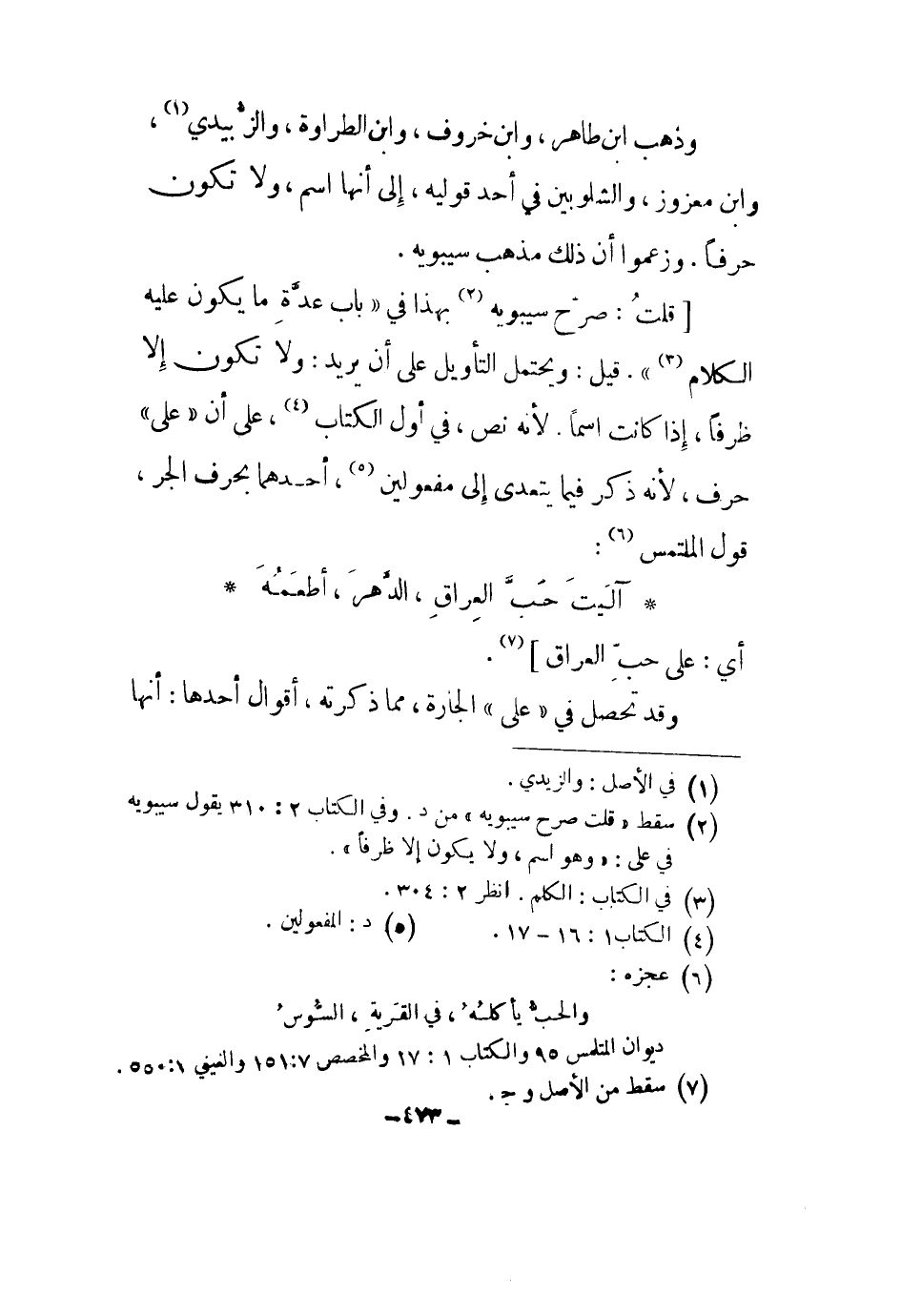 قلت: صرح سيبويه بهذا في باب عدة ما يكون عليه الكلام. قيل: ويحتمل التأويل على أن يريد: ولا تكون إلا ظرفاً، إذا كانت اسماً. لأنه نص، في أول الكتاب، على أن على حرف، لأنه ذكر فيما يتعدى إلى مفعولين، أحدهما بحرف الجر، قول الملتمس: