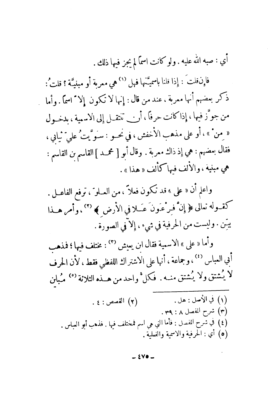واعلم أن على قد تكون فعلاً، من العلو، ترفع الفاعل. كقوله تعالى " إن فرعون علا في الأرض "، وأمر هذا بين. وليست من الحرفية في شيء، إلا في الصورة.