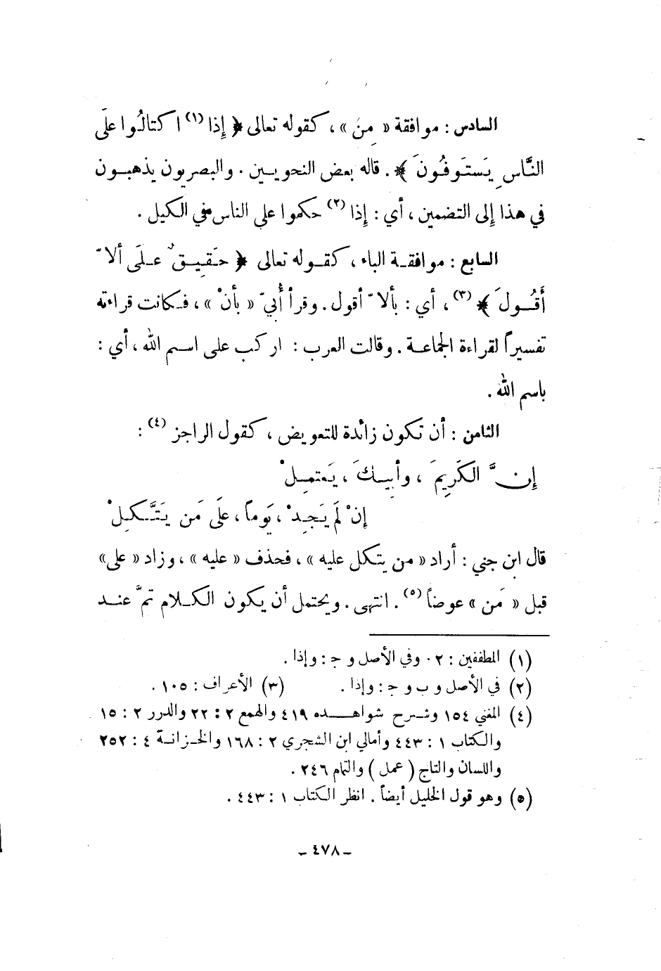 السادس: موافقة من، كقوله تعالى " إذا اكتالوا على الناس يستوفون ". قاله بعض النحويين. والبصريون يذهبون في هذا إلى التضمين، أي: إذا حكموا على الناس في الكيل.
