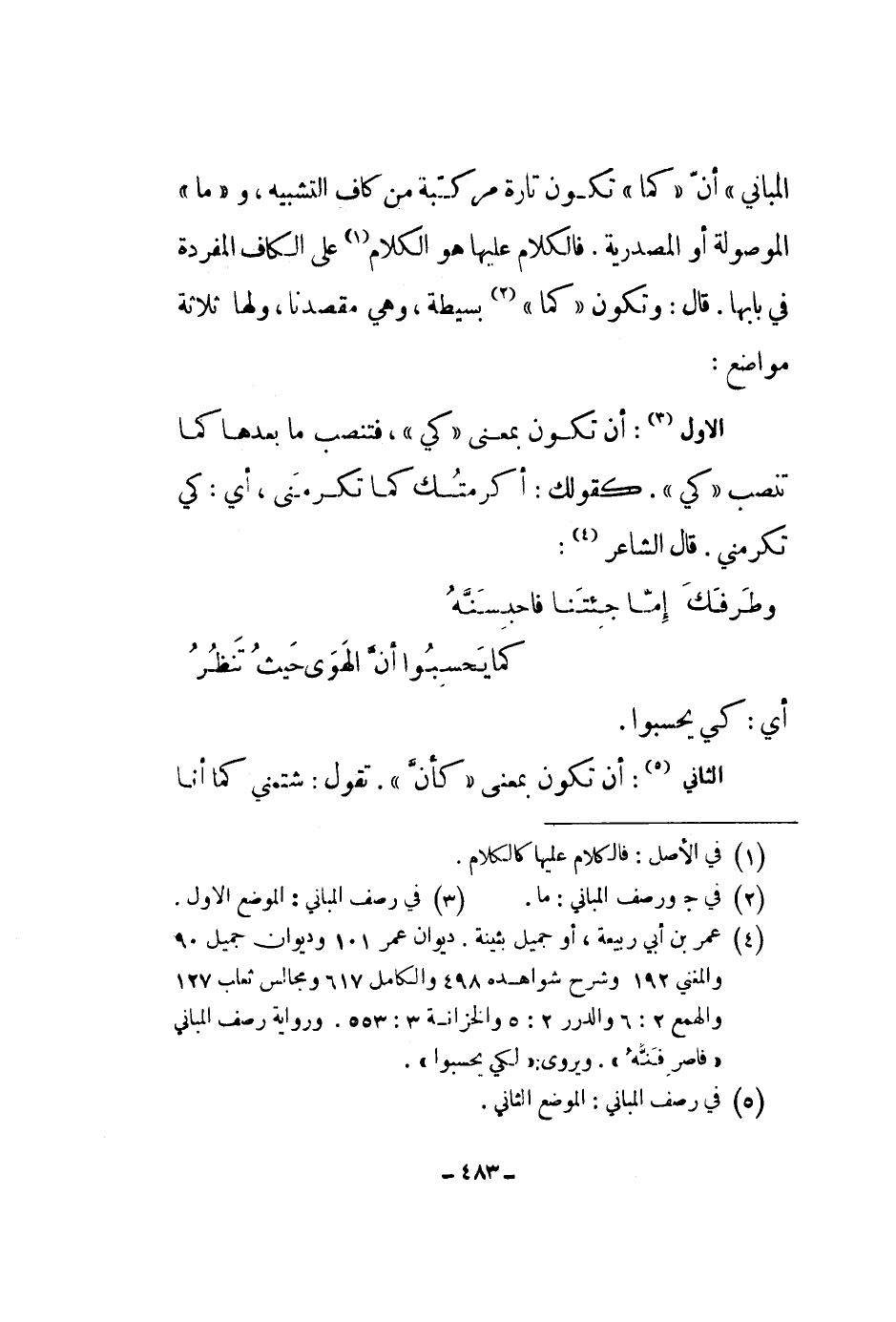 المباني أن كما تكون تارة مركبة من كاف التشبيه، وما الموصولة أو المصدرية. فالكلام عليها هو الكلام على الكاف المفردة في بابها. قال: وتكون كما بسيطة، وهي مقصدنا، ولها ثلاثة مواضع: الأول: أن تكون بمعنى كي، فتنصب ما بعدها كما تنصب كي. كقولك: أكرمتك كما تكرمني، أي: كي تكرمني. قال الشاعر: