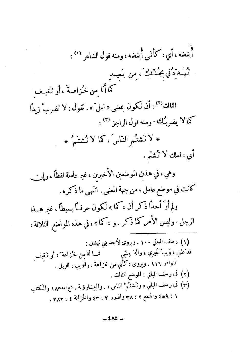 الثالث: أن تكون بمعنى لعل. تقول: لا تضرب زيداً كما لا يضربك. ومنه قول الراجز: