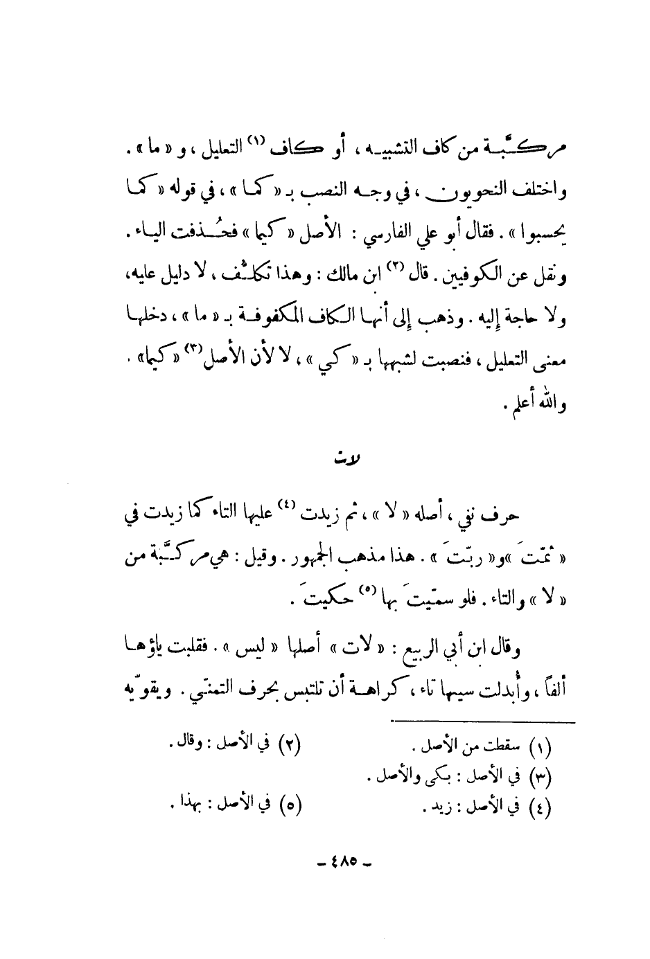 وقال ابن أبي الربيع: لات أصلها ليس. فقلبت ياؤها ألفاً، وأبدلت سنيها تاء، كراهة أن تلتبس بحرف التمني. ويقويه