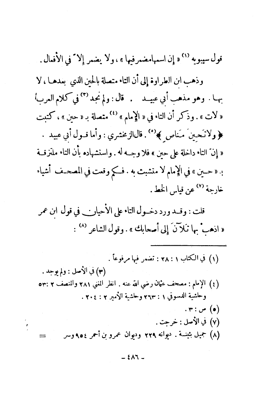 وذهب ابن الطراوة إلى أن التاء متصلة بالحين الذي بعدها، لا بها وهو مذهب أبي عبيد. قال: ولم نجد في كلام العرب لات. وذكر أن التاء في الإمام متصلة بحين، كتبت " ولا تحين مناص ". قال الزمخشري: وأما قول أبي عبيد. إن التاء داخلة على حين فلا وجه له. واستشهاده بأن التاء ملتزقة بحين في الإمام لا متشبث به. فكم وقعت في المصحف أشياء خارجة عن قياس الخط.