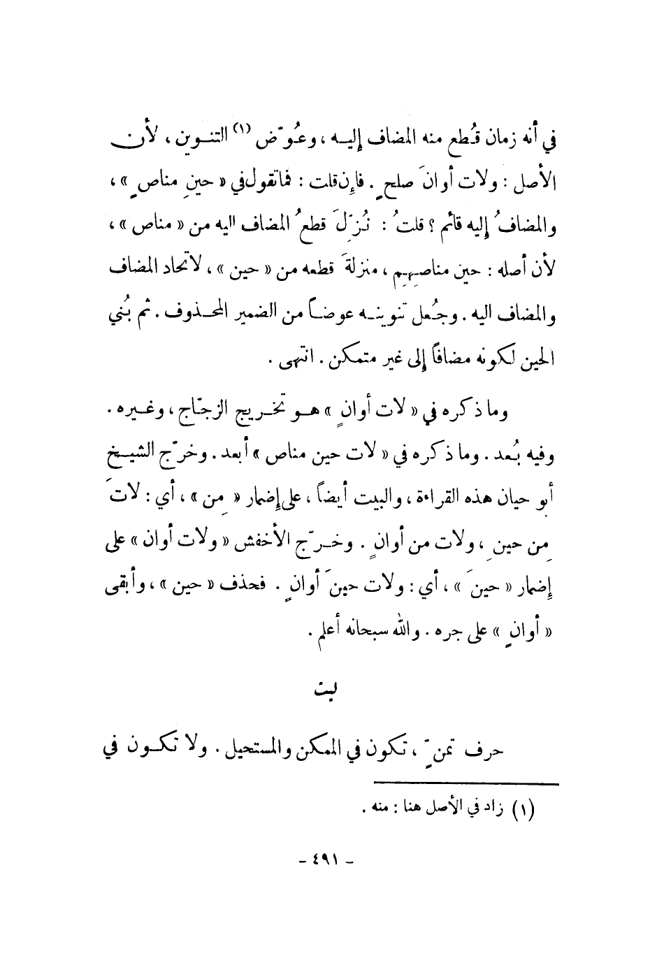 وما ذكره في لات أوان هو تخريج الزجاج، وغيره. وفيه بعد. وما ذكره في لات حين مناص أبعد. وخرج الشيخ أبو حيان هذه القراءة، والبيت أيضاً، على إضمار من، أي: لات من حين، ولات من أوان. وخرج الأخفش ولات أوان على إضمار حين، أي: ولات حين أوان. فحذف حين، وابقى أوان على جره. والله سبحانه أعلم.