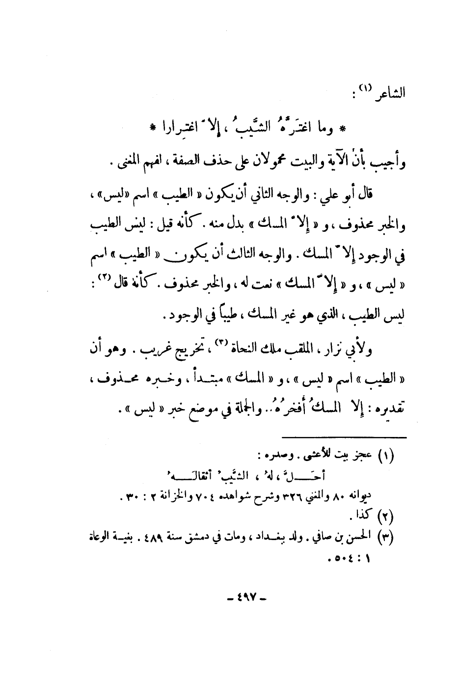 ولأبي نزار، الملقب ملك النحاة، تخرج غريب. وهو أن الطيب اسم ليس، والمسك مبتدأ، وخبره محذوف، تقديره: إلا المسك أفخره والجملة في موضع خبر ليس.