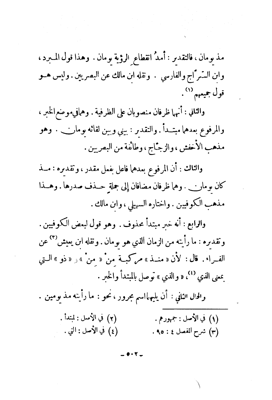 والرابع: أنه خبر مبتدأ محذوف. وهو قول لبعض الكوفيين. وتقديره: ما رأيته من الزمان الذي هو يومان. ونقله ابن يعيش عن الفراء. قال: لأن منذ مركبة من من وذو التي بمعنى الذي، والذي توصل بالمبتدأ والخبر.