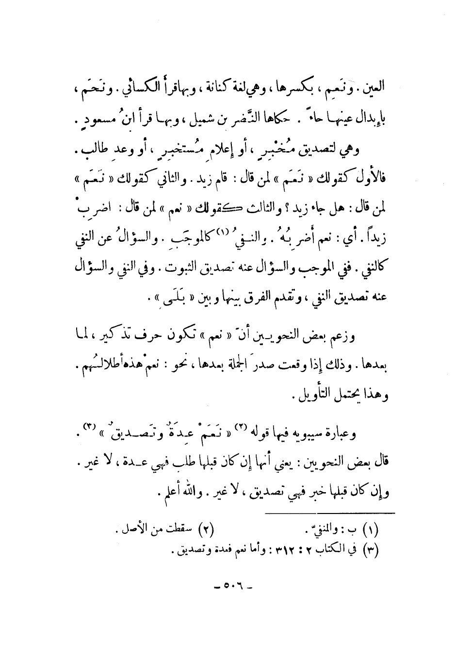 وهي لتصديق مخبر، أو إعلام مستخبر، أو وعد طالب. فالأول كقولك نعم لمن قال: قام زيد. والثاني كقولك نعم لمن قال: هل جاء زيد؟ والثالث كقولك نعم لمن قال: اضرب زيداً. أي: نعم أضربه. والنفي كالموجب. والسؤال عن النفي كالنفي. ففي الموجب والسؤال عنه تصديق الثبوت. وفي النفي والسؤال عنه تصديق النفي، وتقدم الفرق بينها وبين بلى.