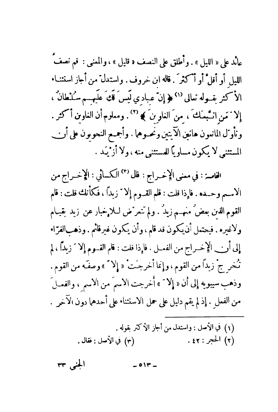 الخامسة: في معنى الإخراج: قلل الكسائي: الإخراج من الأسم وحده. فإذا قلت: قلم القوم إلا زيداً، فكأنك قلت: قام القوم الذين بعض منهم زيد. ولم تتعرض للإخبار عن زيد بقيام ولا غيره. فيحتمل أن يكون قد قام، وأن يكون غير قائم. وذهب الفراء إلى أن الإخراج من الفعل فإذا قلت: قام القوم إلا زيداً لم تخرج زيداً من القوم، وإنما أخرجت إلا وصفه من القوم. وذهب سيبويه إلى أن إلا أخرجت الأسم من الأسم، والفعل من الفعل. إذ لم يقم دليل على حمل الاستثناء على أحدهما دون الآخر.