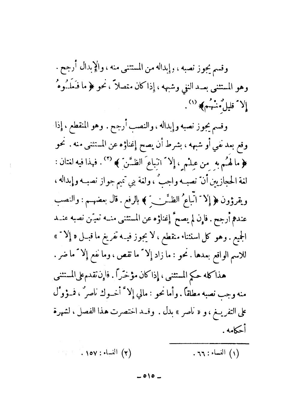 وقسم يجوز نصبه وإبداله، والنصب أرجح. وهو المنقطع، إذا وقع بعد نفي أو شبهه، بشرط أن يصح إغناؤه من المستثنى منه. نحو " ما لهم به من علم، إلا اتباع الظن ". فهذا فيه لغتان: لغة الحجازيين أن نصبه واجب، ولغة بني تميم جواز نصبه وإبداله، ويقرؤون " إلا اتباع الظن " بالرفع. قال بعضهم: والنصب عندهم أرجح. فإن لم يصح إغناؤه عن المستثنى منه تعين نصبه عند الجميع. وهو كل استثناء منقطع، لا يجوز فيه تفريغ ما قبل إلا للإسم الواقع بعدها. نحو: ما زاد إلا ما نقص، وما نفع إلا ما ضر.