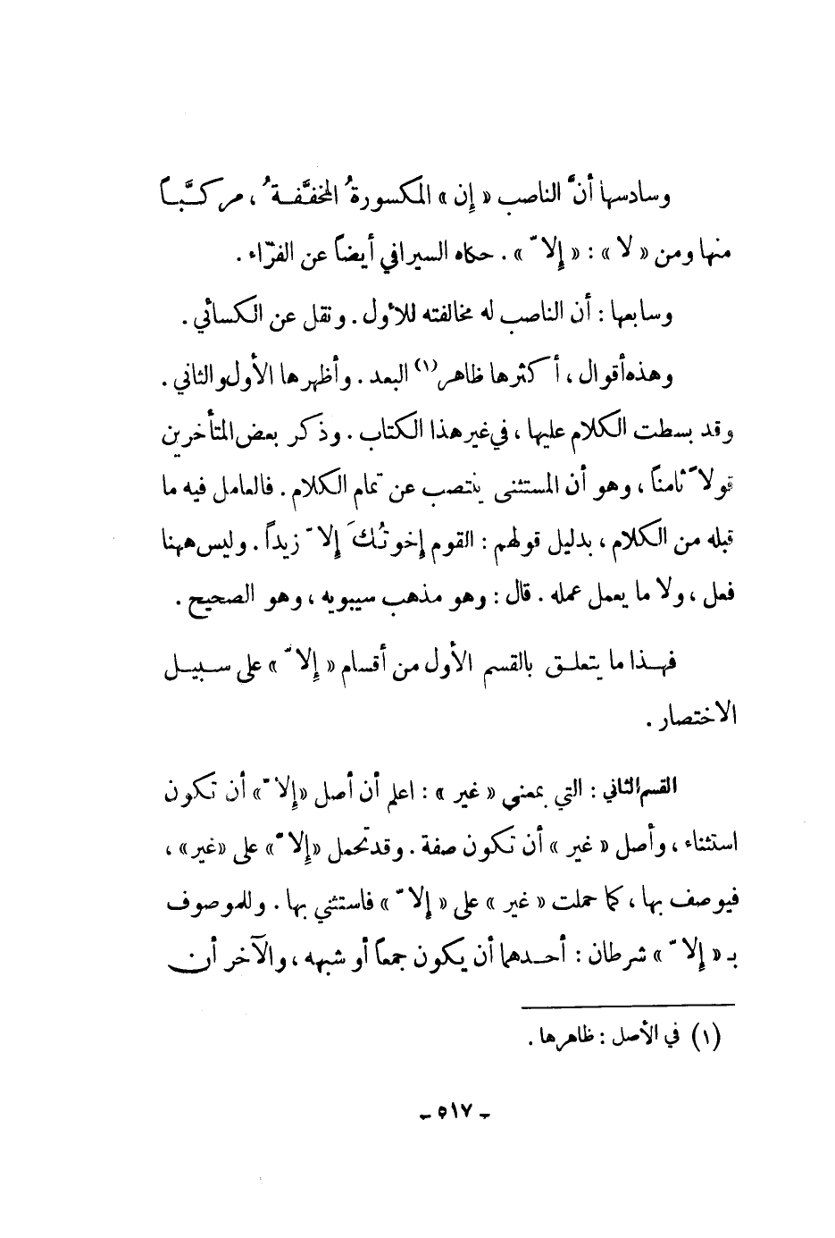 القسم الثاني: التي بمعنى غير: اعلم أن أصل إلا أن تكون استثناء، وأصل غير أن تكون صفة. وقد تحمل إلا على غير، فيوصف بها، كما حملت غير على إلا فاستثنى بها. وللموصوف بإلا شرطان: أحدهما أن يكون جمعاً أو شبهه، والآخر أن