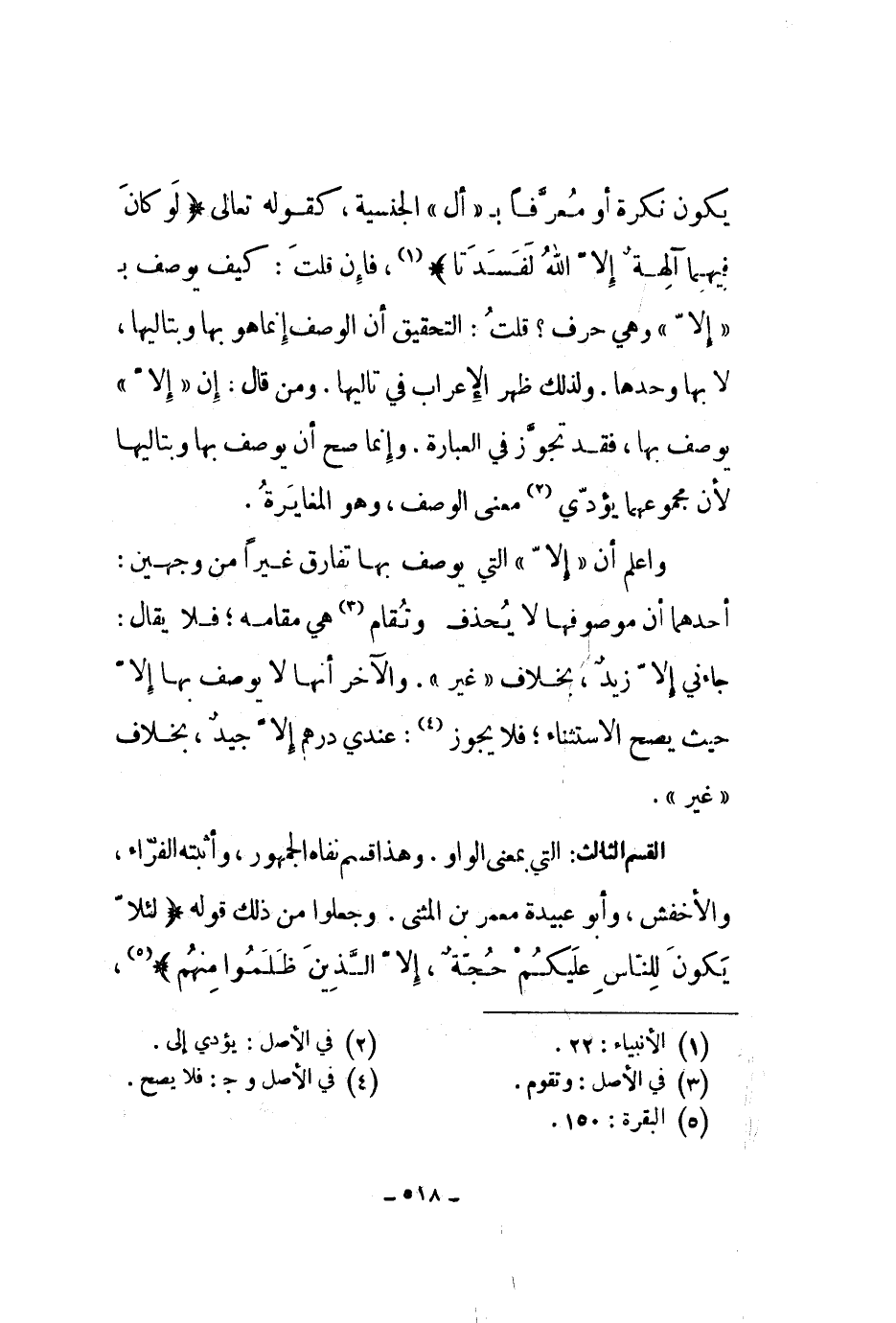 القسم الثالث: التي بمعنى الواو. وهذا قسم نفاه الجمهور، وأثبته الفراء، والأخفش، وأبو عبيدة معمر بن المثنى. وجعلوا من ذلك قوله " لئلاً يكون للناس عليكم حجة، إلا الذين ظلموا منهم "،