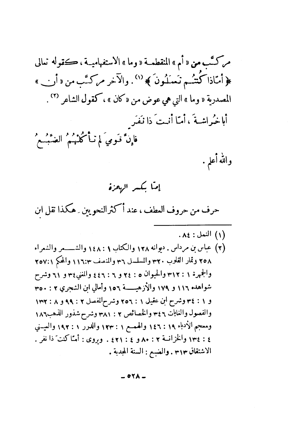 مركب من أم المنقطعة وما الاستفهامية، كقوله تعالى " أماذا كنتم تعملون ". والآخر مركب من أن المصدرية وما التي هي عوض من كان، كقول الشاعر.