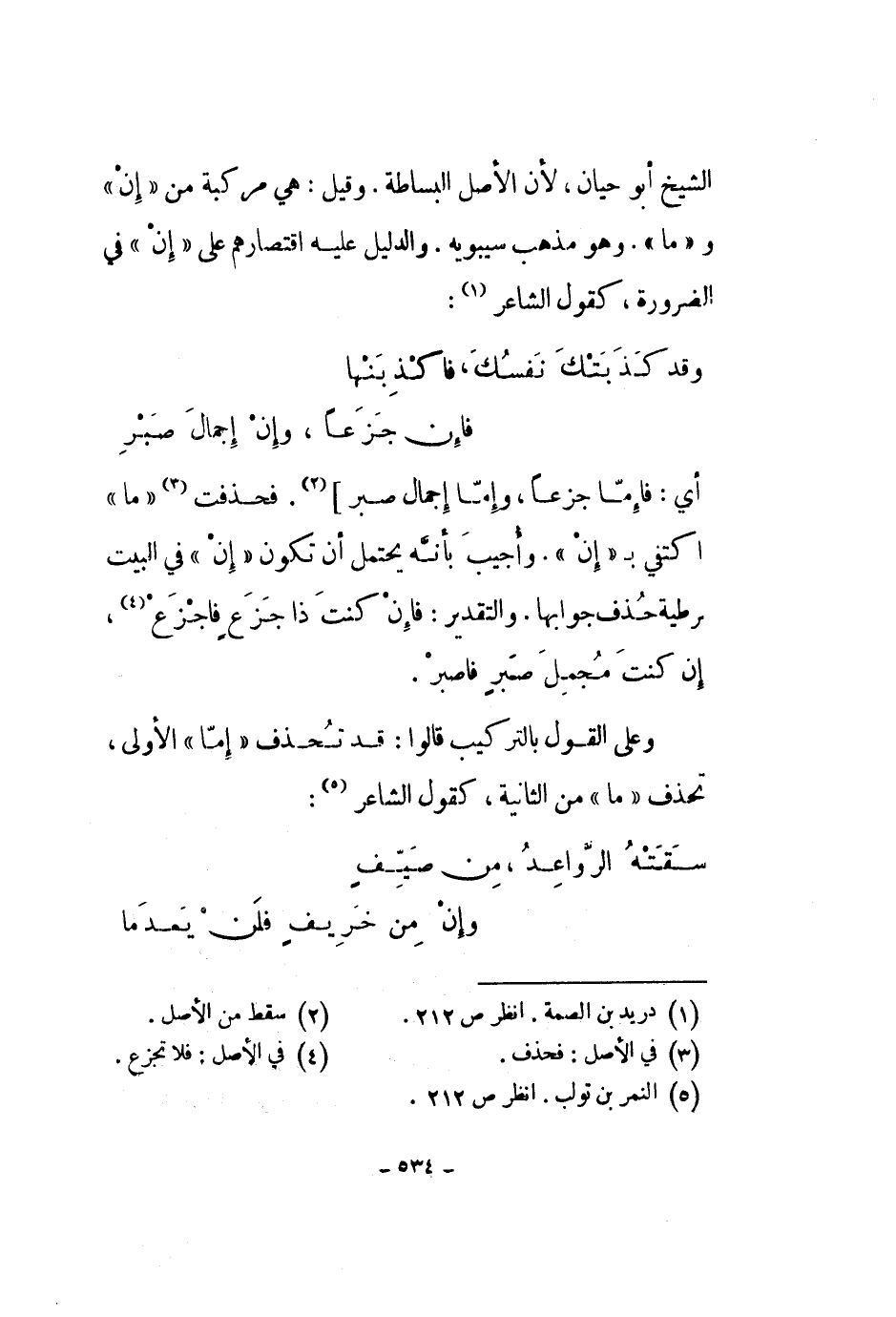 أي: فإما جزعاً، وإما إجمال صبر. فحذفت ما اكتفي بإن. وأجيب بأنه يحتمل أن تكون إن في البيت شرطية حذف جوابها. والتقدير: فإن كنت ذا جزع فاجزع، إن كنت مجمل صبر فاصبر.