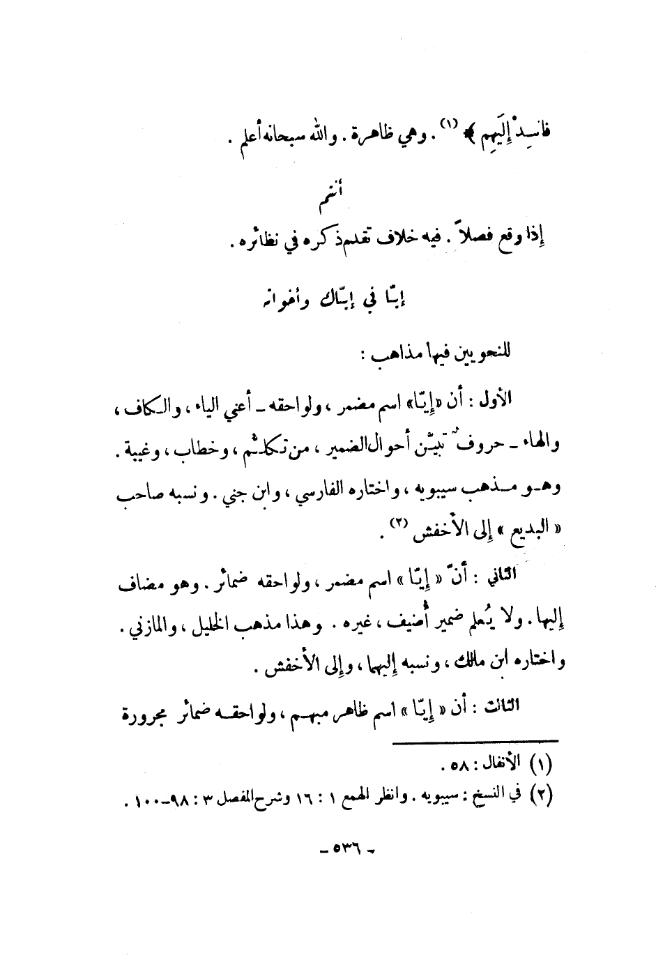 للنحويين فيها مذاهب: الأول: أن إيا اسم مضمر، ولواحقه - أعني الياء، والكاف، والهاء - حروف تبين أحوال الضمير، من تكلم، وخطاب، وغيبة. وهو مذهب سيبويه، واختاره الفارسي، وابن جني. ونسبه صاحب البديع إلى الأخفش.